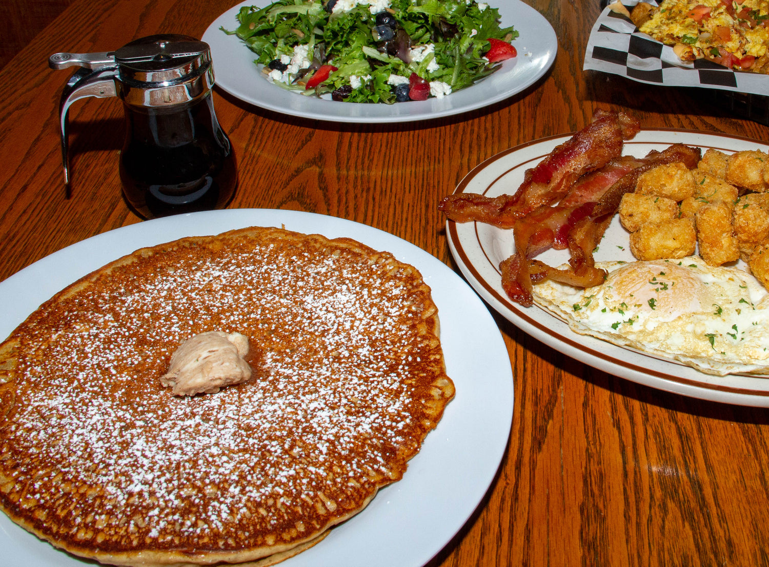 Our pancakes are made with applesauce and oat milk, not eggs and whole milk. They are not fluffy like a traditional pancake.